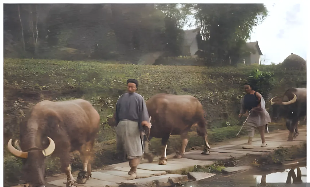 这个场景叫石板路赶牛,水牛的角弯成半个月牙,鼻绳拽着,脚掌踩在湿漉漉的石板上咚咚作响,河沟里水面晃一层金光,赶牛人袖子挽到臂弯,手里的细鞭随脚步轻点,早年回老家,我也在田埂上跟着叔叔走过一段,鞋底沾泥,身上却被晚风吹得清爽。