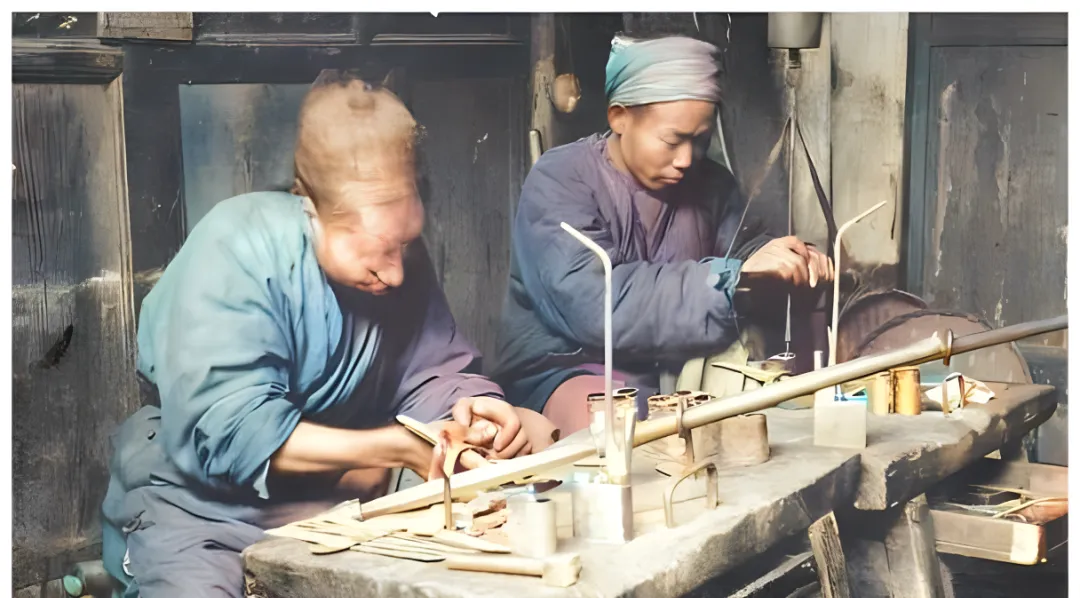 这个场面叫水烟袋作坊,木案上摆满铜火盅、竹节杆、细长的弯嘴,炉火蓝得发亮,师傅低头用小锉刀推金属边,碎屑一颗颗往下跳,旁边徒弟拿线缠接口,手指头被铜件磨得起茧,我妈见到这张图笑着说,旧时男人歇手就爱来两口,说是过水更柔和,可也挑器物,嘴子太细呛,太粗又没劲。