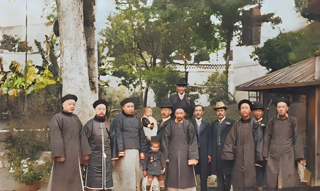 这张叫院里相会,树影把地上切成一块块,孩童被大人扶着,手里握着小折扇,西式礼帽和瓜皮帽挤在一块儿,彼此客客气气,谁也不越线,这样的场景在当时不稀罕,却也各打各的算盘。