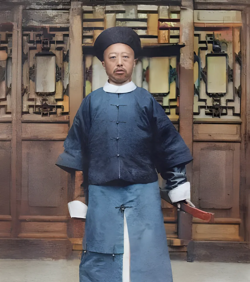 图中这位叫醇亲王奕譞,蟒缎袍面蓝到发黑,袖口翻出一圈雪白,帽翎没戴,整个人立在雕花门洞前,神态稳当,腰上横束宽带,垂下一撮穗子,风一来轻轻扫过,他这一身是家法与规矩的样子,奶奶说起老辈儿的礼数,最讲究站要有站相,坐要有坐相,这照片一眼就能懂。