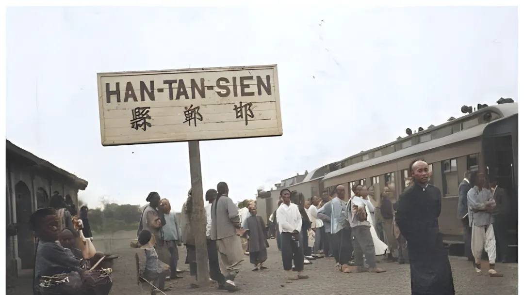 这个地方叫直隶邯郸县火车站,木牌上英汉并列,站台上人一波一波往车门凑,衣摆被风鼓起来,孩子抱在怀里冲着火车瞧,汽笛没吹也仿佛听见了,爷爷讲他第一次坐火车就是去省城,买的硬座,拎着布兜和热水瓶,窗外一大片玉米地往后倒,现在高铁一穿,半天就回来了,车厢里连开水都不用追着灌。