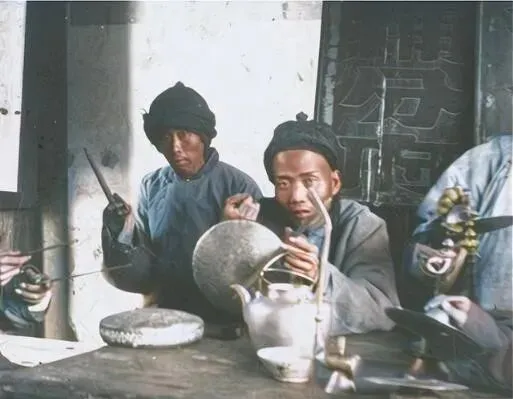 这桌上的家伙事儿不难认,砧子、铲刀、铆钉,最抢眼的是一只皮质风箱外的铜水壶,图中人正端着半圆的旧锅,眼角里有火光的反射,他们在修补裂口,先把口边磨出一圈亮线,再烫上一条锡,手腕得稳,力气要匀,一抬一按,声音“咴咴咴”地顺着案板传出去。