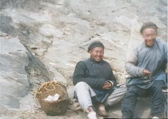 这只竹篓编得紧,沿口起了细细的毛刺,边上的男人把胳膊搭在膝上笑着喘,另一位眯着眼,身边石壁冷硬,风一吹衣襟乱跳,他们八成是挑夫,刚把担子放下,篾条勒出来的红印子在肩窝一条一条,很快就会退,下一程还得再压上去。