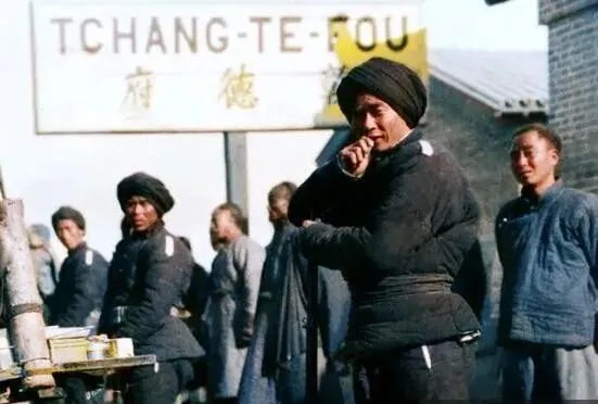 这个场景最显眼的是肩章和围头巾,旁边的招牌把“彰德府”几个字挺直挂着,人都不看镜头,各自忙各自的神色,队伍后边有人把手插进袖里,是挡风还是习惯不好分辨,反倒觉得像一帧会喘气的画,那时的街头并不喧闹,风大,尘土上来,人说话要靠近点才听得清,现在我们习惯了降噪耳机,走在马路上也要把世界调小一格。