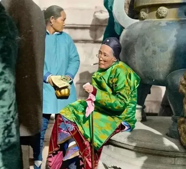 图中这位奶奶手指间夹着的是旱烟袋,铜嘴细长,杆子乌亮,烟锅像小铜盏一样,坐在石座上微微前倾,嘴角叼着烟,绿缎袄子油光发亮,袖口里还露着一抹绛红,旁边站着的使女提着黄铜茶壶,壶嘴短粗,提梁圆润,奶奶眯着眼的那个劲头儿,像是在打量来往人群,也像是在等一口热茶把烟呛压下去,外人只看热闹,我却想起外婆说旧年冬天院里刮风,缩在门洞里点火绒,先烤热烟锅再装烟丝,不急不躁,抽完一锅,手心都回了温。