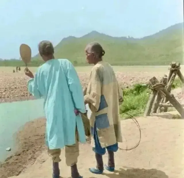 图中两位裹着旧布的老太太,脚上裹着的是小脚布鞋,鞋尖翘起,胫裹麻带,手里还抖着一把蒲扇,扇面椭圆,扇骨粗直,站在河埂边指指点点,像是在算着水势和地里的苗情,那时候天热没有电扇,走几步就得扇两下,脚下路烫得冒油,她们的身影瘦却硬,风一来,衣摆“哗啦”一响,像干草贴着石头划过的声音。