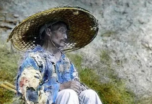 这个老汉头顶的是蒲草斗笠,沿口宽大,草缝里有日头晒褪的银灰色,身上衣裳补丁叠着补丁,袖口磨起毛边,他坐在坡地上喘匀气,手边杖子半埋在草里,奶奶说下大雨的时候,斗笠“嗒嗒”直响,雨线顺着帽檐往外泻,人不至于全湿透,等天晴了,帽子往阳光里一搁,草香和泥腥子一股脑冒出来,现在谁出门不是防晒衣加遮阳帽,斗笠反倒成了舞台道具。