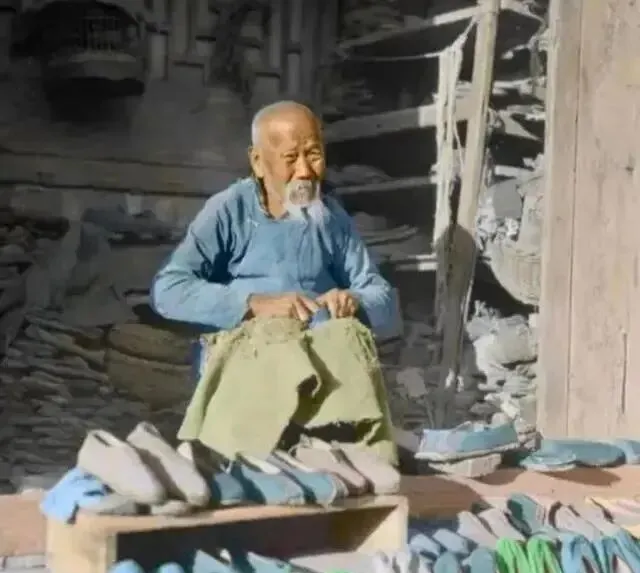 这个矮凳上坐着的叫卖布鞋的老汉,他面前铺了一溜布底鞋,青的、灰的、带蓝边的,鞋面用粗线缝得一粒粒小米似的疙瘩,鞋帮微翘,鞋底厚重,拿在手里一压就吱呀作响,他低着头,把鞋口里露出来的一根线头捻顺,跟我外公一个习惯,外公做鞋讲究三件事,麻线先腊过,底子要纳实,楦头得跟脚,现在买鞋动不动“气垫”“缓震”,穿着轻是轻,可下雨踩在青石板上,还是他那种布底不打滑。