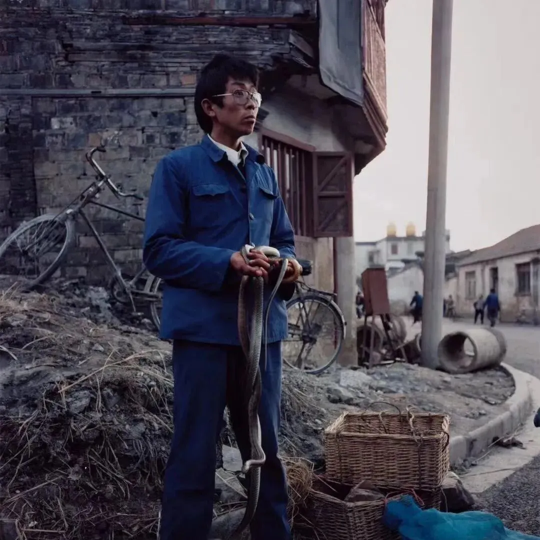图中男人手里的家伙叫蛇,别被吓着,这摊前的两只大竹筐才是主角,粗口的篾条一圈圈箍着,边上还压着一张蓝色的旧网,像极了那会儿集市上的流动药摊,吆喝声一来人就围上去,爷爷说这类摊子最讲究胆量,眼一抬手一抖,人群就炸了锅,转头看那破墙根斜倚的二八大杠,自行车铃不响也像在叹气,街面不宽,尘土往上扑一层,这就是八十年代的市井味。