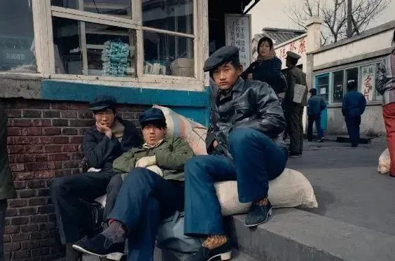 图里这几位靠在门台上,屁股底下的叫编织麻袋,鼓鼓囊囊一摊,里头可能是被褥,也可能是干粮罐头,一袋就是一个家的路,那会儿坐长途客车得抢座,手里攥着纸质车票,谁先挤上谁先占,叔叔说第一次进城就是这么蹲着等车,冻得脚后跟直抽筋,现在拉杆箱啪啪滚走得体面多了。