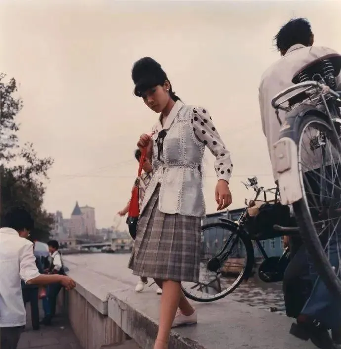 这个高高梳起的发型叫高耸发髻,格子裙一摆,白背心边上还缀着蕾丝,女孩手里提一只红包,脚侧那辆自行车把手亮得晃眼,小时候我们见到这样的姐姐都不敢喊,觉得她走出来像电影,后来街上流行烫头烫卷,现在干脆扎个马尾就走,美的样子一直在换。