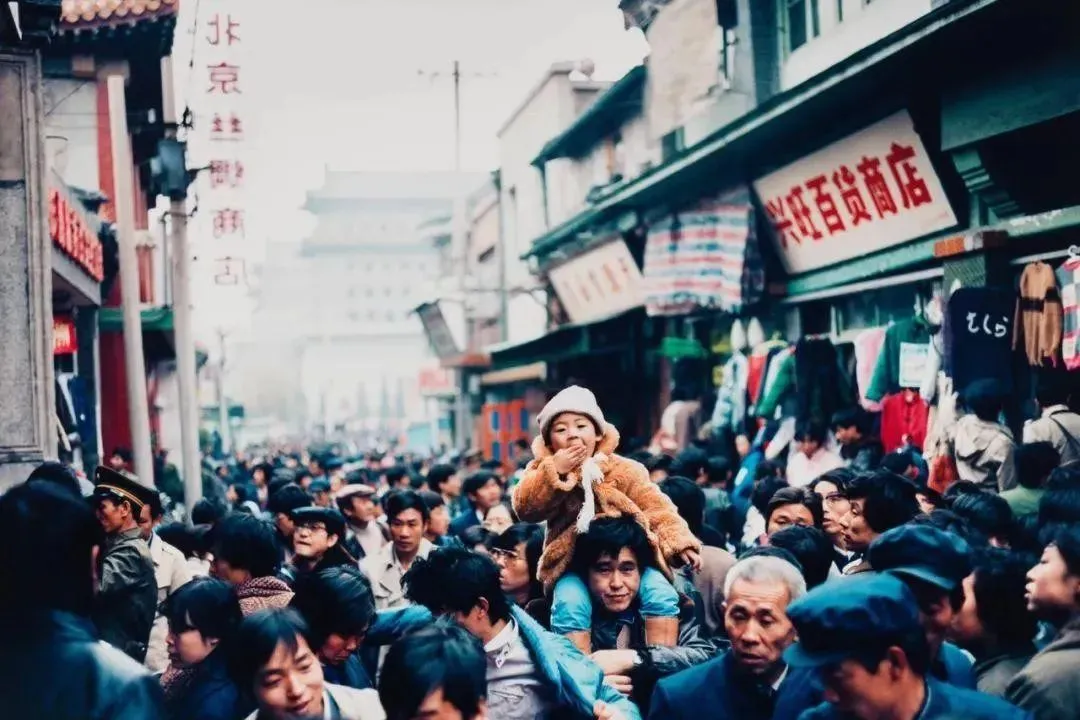 图中这条路叫集贸街,人头攒动,牌匾上喷着红字,布匹晾成一道道彩条,孩子骑在父亲肩上,手里攥着糖块往嘴里送,爸爸说过年要来这买件新衣,试穿不合适也不退,揣回家自己改,现在网店一键退换,人不挤了,心愿也容易满足。