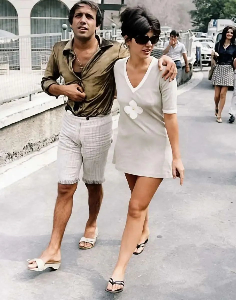 照片中是意大利演员、导演、歌手阿德里亚诺·塞伦塔诺与妻子克劳迪亚·莫里散步的画面,拍摄时间约为60年代末至70年代初。