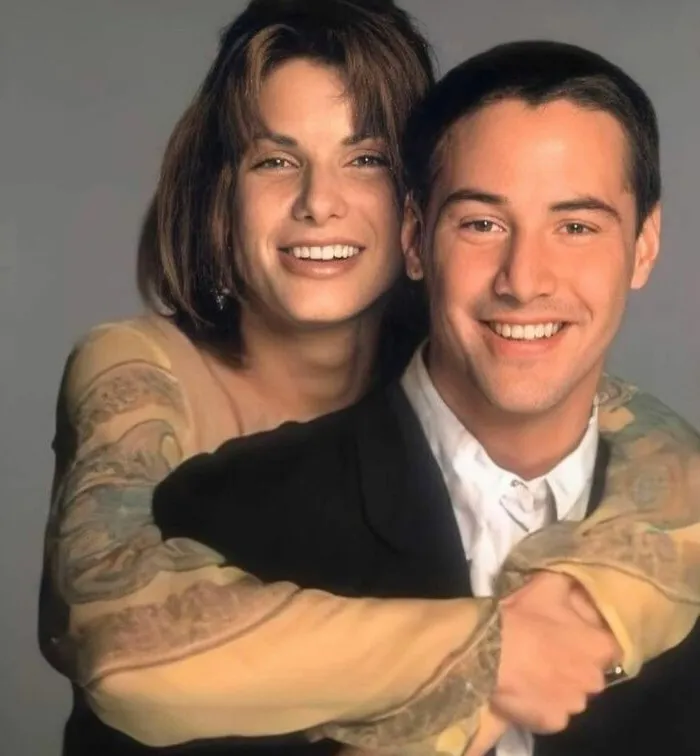照片中是基努·里维斯与桑德拉·布洛克在1994年电影《生死时速》宣传与拍摄期间的画面。