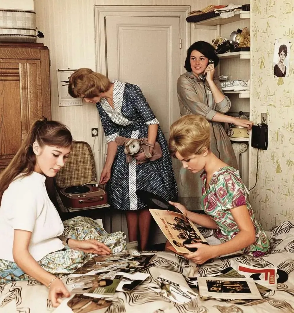 照片定格了60年代法国家庭里一场充满氛围感的“黑胶听歌夜”:小房间里,几位少女一起听唱片、翻看歌手照片。