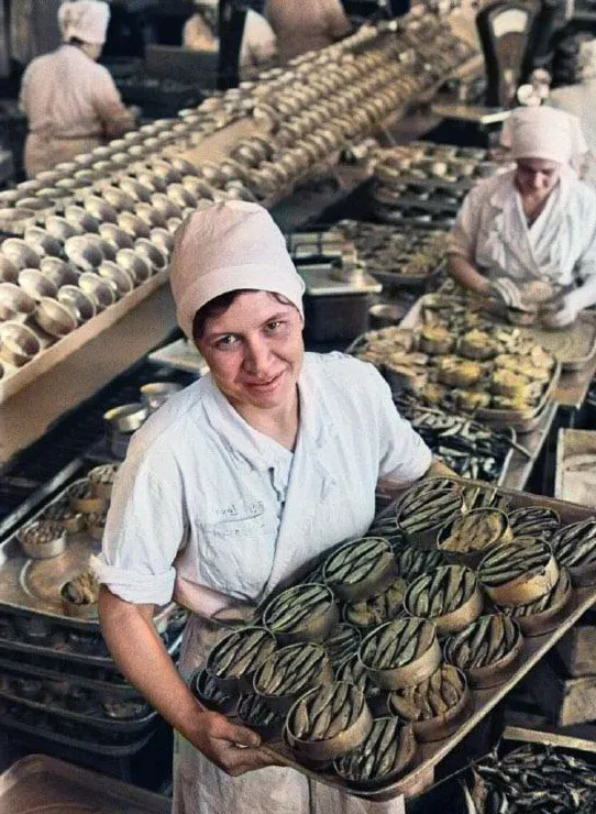 背景中是长长的操作台与传送带,体现了苏联食品工业中机械化与手工操作并存的特点。