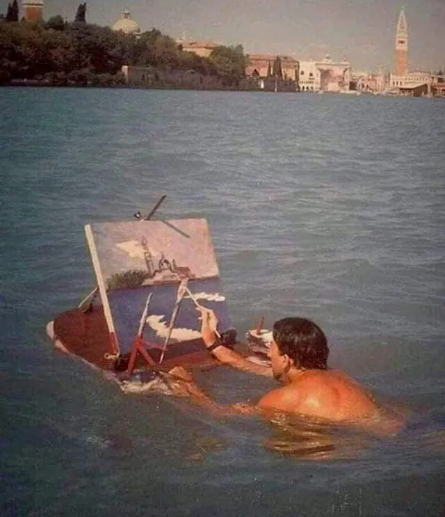 这张传奇照片拍摄的是一位画家站在威尼斯建筑前的水中,手持画布与画笔创作。