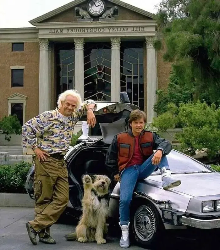 照片是1985年经典电影《回到未来》片场,迈克尔·J·福克斯(饰演马丁·麦弗莱)与克里斯托弗·洛伊德(饰演布朗博士)站在传奇跑车 DeLorean 旁,背景是加州环球影城的希尔谷法院。