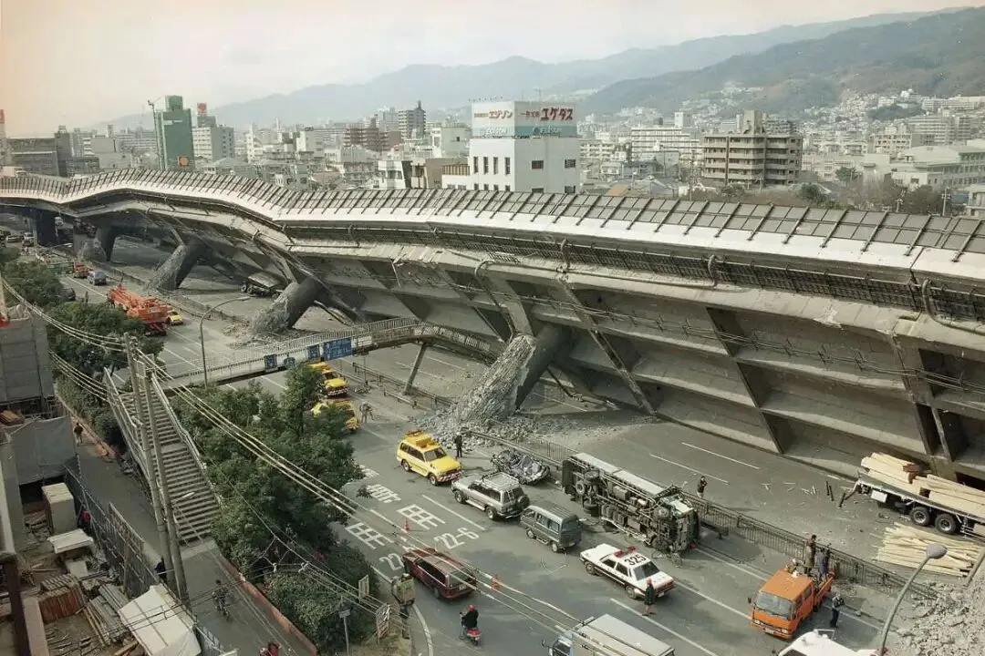 画面中是阪神高速道路的毁灭性坍塌,数段桥面整体倾覆,这条连接神户与大阪、承担两市40%车流的交通大动脉彻底中断。
