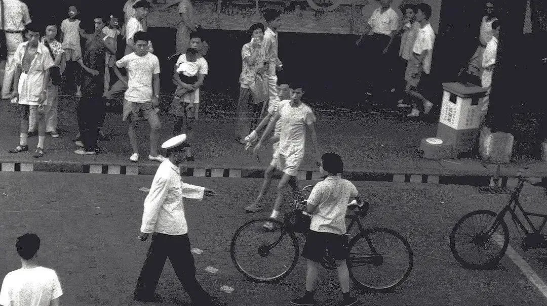 图中穿白袍戴白帽的这位叫交通协管,那年头红绿灯还不多,靠人挥手指挥,袖口一抖,手中小旗一横,行人自觉在路沿边站好,自行车缓一缓,孩童被大人一把拎住后领口不让乱窜,奶奶说当时过马路就看这顶白帽,谁敢不听啊。
