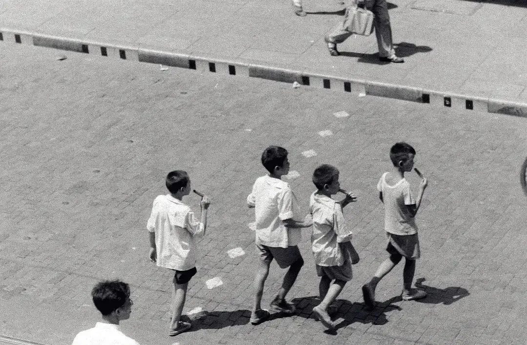 这队孩子嘴里叼着的叫赤豆冰棒或者老冰棍,纸皮一撕,带着一点霜气,走一步咬一口,脚下的青砖把影子拉得长长的,小时候我也这么吃,太阳晃得眼睛眯成一条缝,舌尖被冻得有点发木,可还想再舔一口。