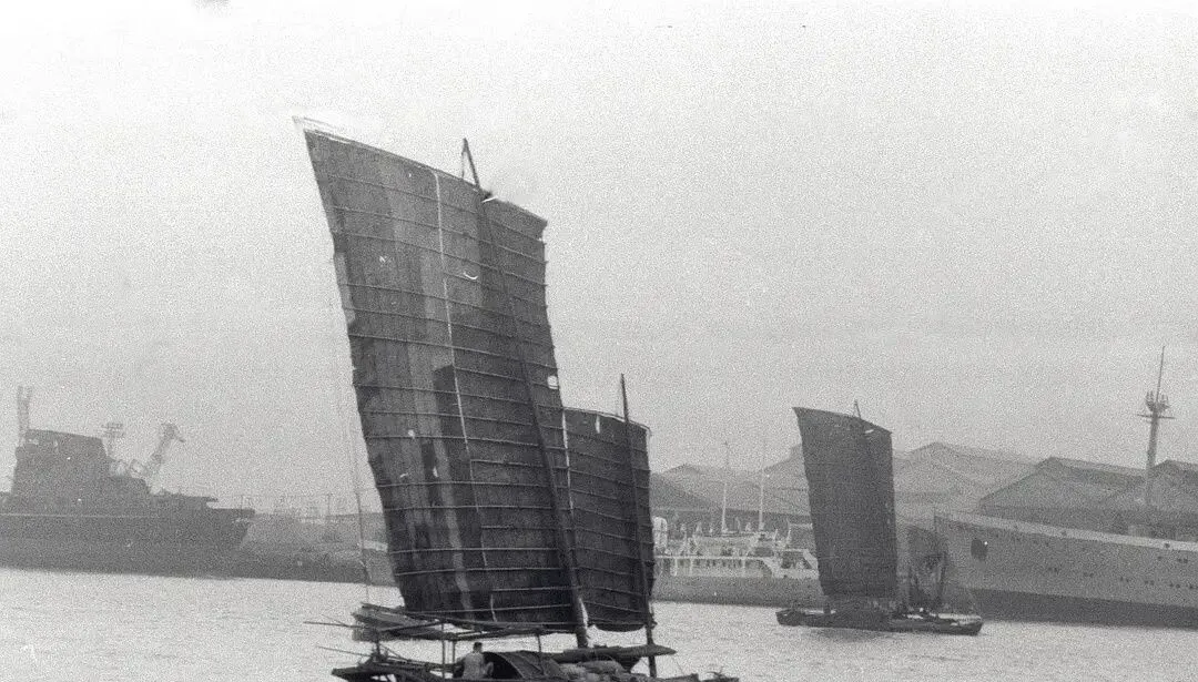这个高挑弯曲的叫沙船风帆,帆片一格一格,用竹篾打骨,风一鼓起,整条船像猫一样顺水贴过去,岸上吊机戳着脖子,仓库屋脊连成线,老法师说那时还常见到帆船和拖轮并排走,江面像新旧交替的课堂。
