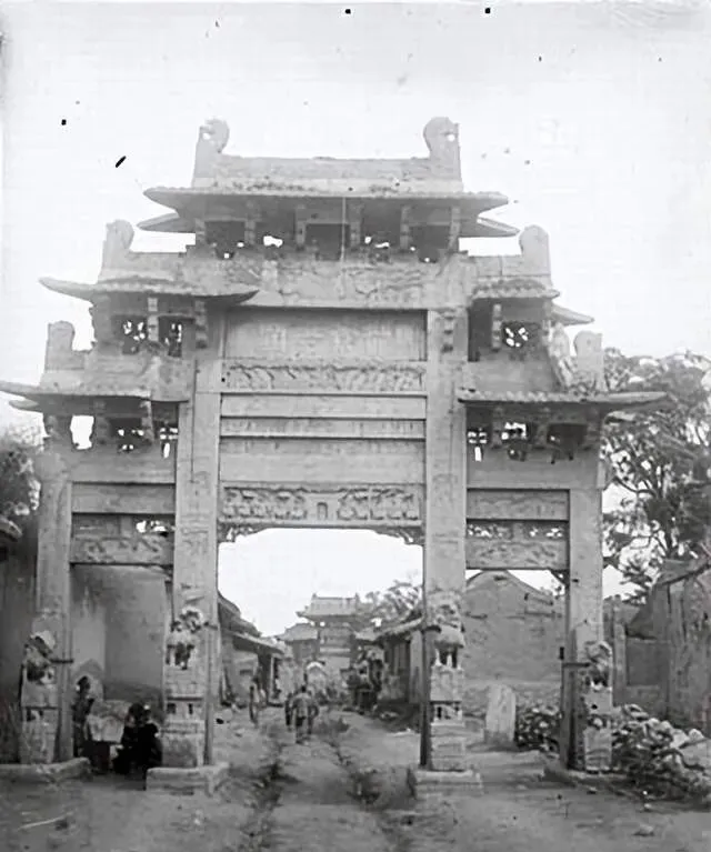 图中这架子叫牌楼,通体石刻,额枋满是缠枝和瑞兽,四角蹲着小狮,过牌楼要收一收嗓门,木牛车从底下咕噜噜滚过去,车把式抬手压着帽檐,人和匾额擦身而过,心里都打个鼓。