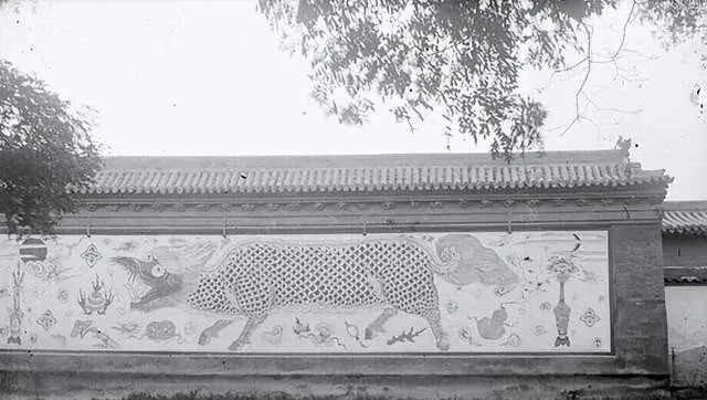 这堵彩画墙叫影壁,正中一只奔跑的瑞兽,身上的点子排得密,周围簇着云纹和博古,颜色尽管在黑白里,可层次分明,像是会从墙上蹦下来似的,孩子们在这堵墙前玩老鹰捉小鸡,转弯就躲到兽尾巴后头。