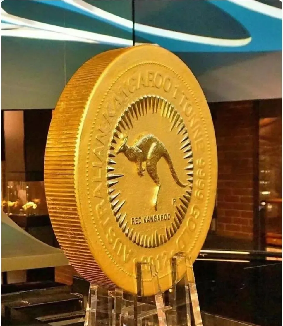 这面闪着金光的圆盘叫百万澳元金币,边缘是整齐的齿纹,正面浮着跳跃的袋鼠,站在它面前,人像被金色晃了一下眼,爷爷笑说这玩意儿要放到我们那会儿,怕是得十个大汉抬着走,现在的钱存在卡里,一个指纹搞定,那种“份量”的感觉倒是少了。