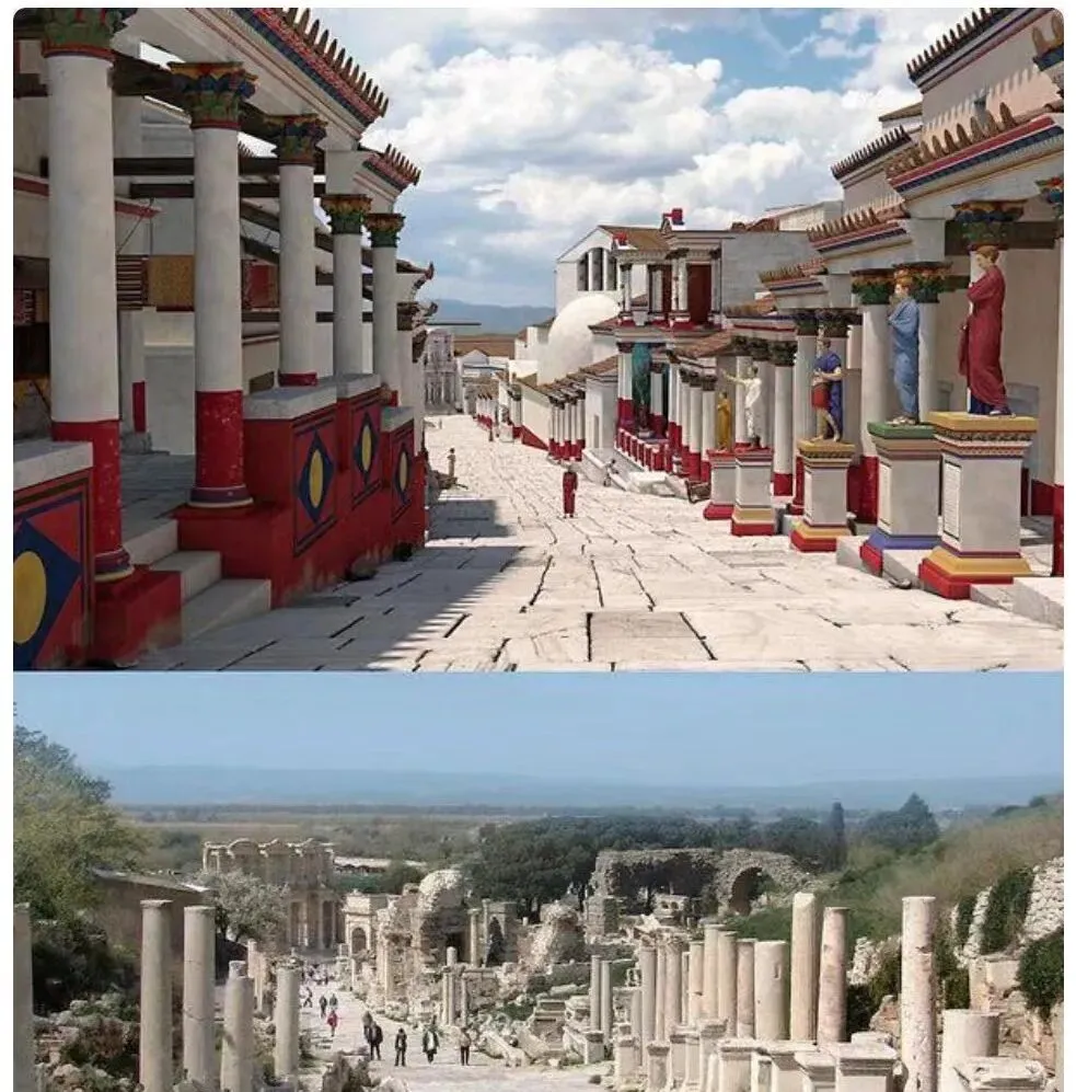 这条色彩鲜亮的街叫古希腊街道复原景,红蓝绿的柱头像刚刷了漆,石板路被踩得发光,墙上立着神像,转个弯就是一片遗址现场,导游说以前的城邦也爱弄鲜艳颜色,现在留到我们眼前,白的多彩的各有味道。