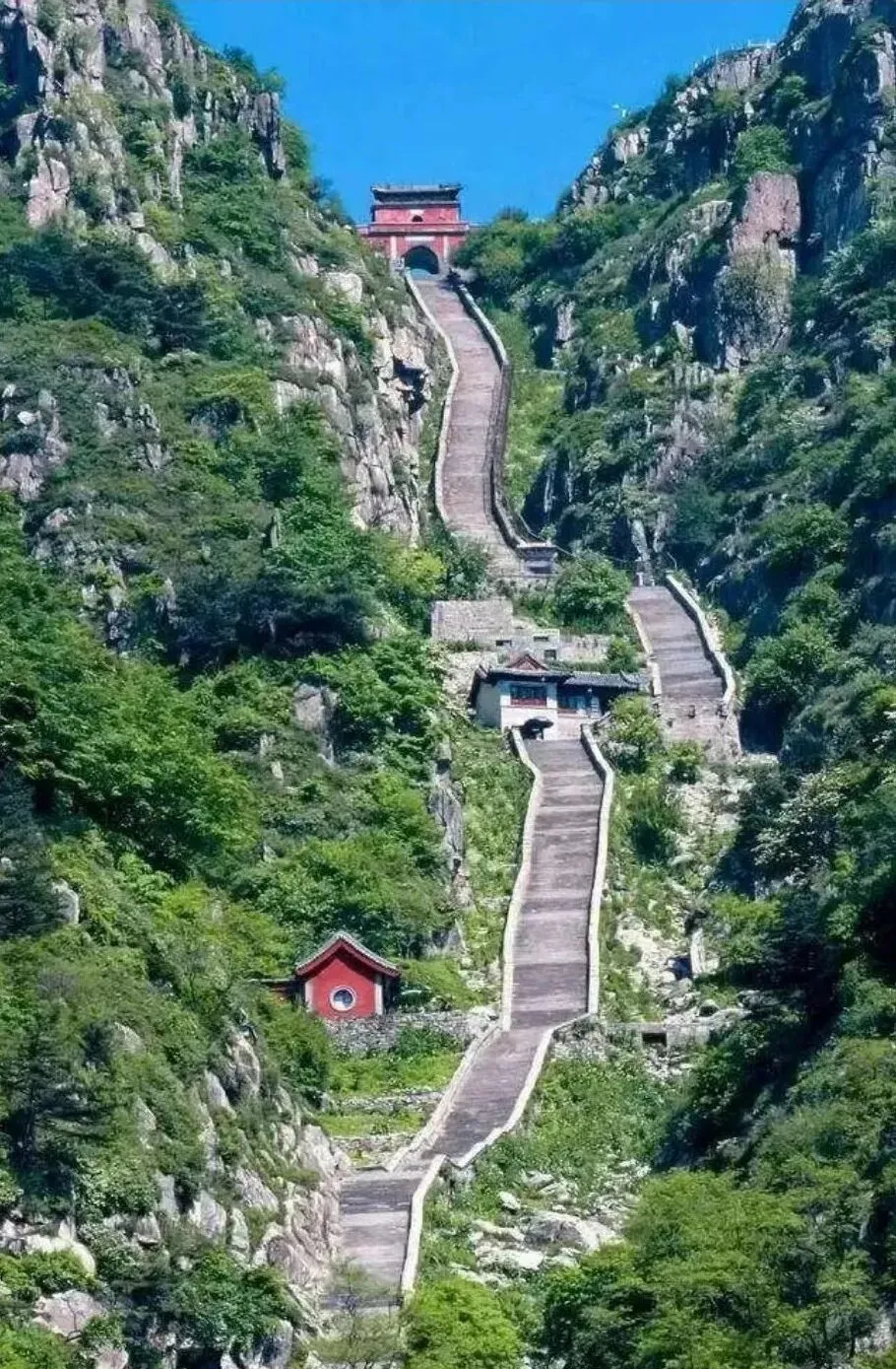 这条笔直插进天门的路叫泰山中天门之道,台阶一节连一节,边上是石崖和松树,风一过叶子哗啦啦响,爸爸说他年轻时清晨摸黑上去,等到日出时云海翻滚,汗水和雾气一起往下淌,现在有索道有护栏,轻松是轻松了,登顶那口气还是得自己争。
