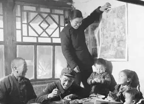 屋里这一幕叫贴年画,窗棂打着格,墙面糊着报纸,女人踮脚,孩子举糨糊碗,男人在旁边笑眯眯指挥,说再往上点,贴歪了吉祥也打折扣,年画一上墙,屋里立马亮堂起来。