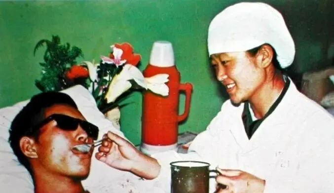 这个白帽白褂是住院部的护士服,旁边那只绿釉搪瓷缸可不只是喝水的,熬的米汤、冲的药粉都靠它盛,战士带着墨镜躺着,姑娘一勺一勺喂下去,轻声问烫不烫,病房窗台常摆着塑料花,鲜亮得有点倔强。