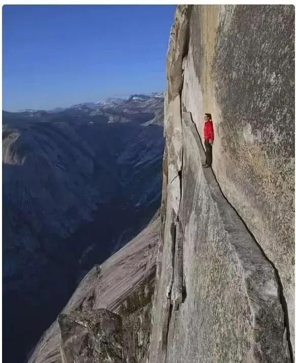 这条贴墙的细缘叫岩脊踏带,灰白色的岩面被风磨得发亮,人要贴着墙根侧身走,脚尖外沿刚好踩住那道窄台,心一慌腿就软了,照片里那抹红色像一颗定心丸,可真要我上去,还是算了吧,现在有安全绳和保护点,早年可全凭胆量和经验。