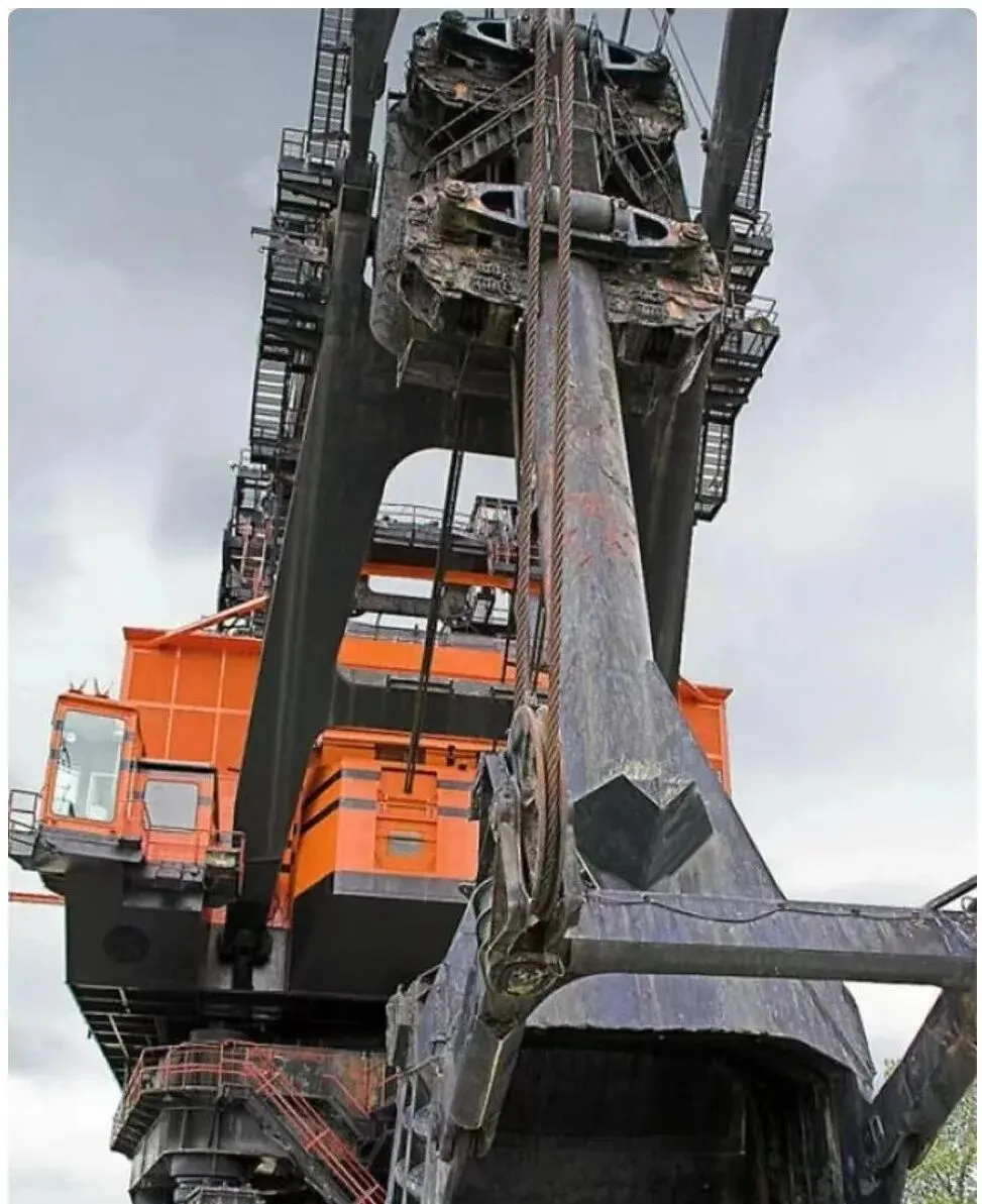 这台庞然大物是矿上用的斗轮或拉铲挖掘机,黑色的臂杆粗得像桥墩,钢缆拧成几股,张力一看就不小,橙色的驾驶舱像挂在巨兽肩头的小盒子,机器启动时那种低沉的嗡鸣,隔着老远都跟着胸腔震,爷爷说,工程这玩意儿靠的是吨位和可靠,看着就踏实。