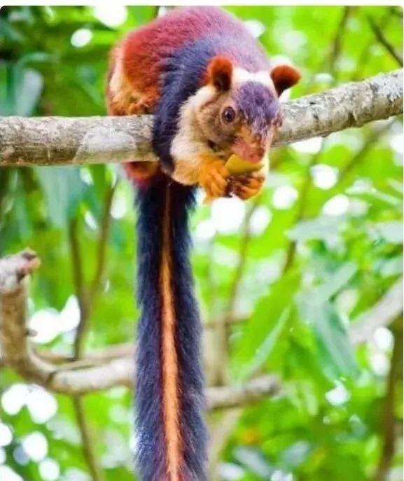 这个彩色的家伙叫印度巨松鼠,背皮从栗红到紫黑渐变,尾巴长得离谱,一垂能拖到树杈下,动作却挺轻盈,叼着果子咔咔嚼两口就蹿远了,我第一次见以为谁把毛线绕树上了,走近才看清那双圆溜溜的眼睛。