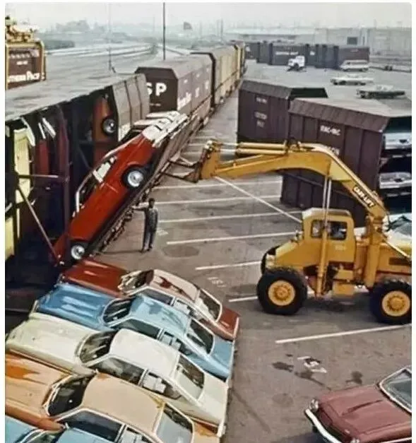 这张老照片里是在把轿车装进火车车厢,黄色臂车从侧面抬起红色小车,角度又陡又险,旁边站着的人戴着帽子抬头指挥,七八十年代就这么干,靠眼力和手劲,现在都是全封闭的多层车厢自动装载了。