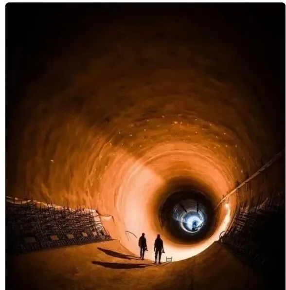 这个像火圈的地方是正在修建的隧道,圆形断面被灯光一照,墙面泛着橙色的暖,靠外侧的钢筋网片还没封模,两个工人影子被拉得老长,走路都像在时光隧道里,师傅说最怕的是滴水落到耳朵边,一惊一乍的,久了就习惯了。