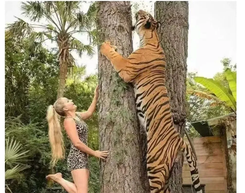 图中这猛兽和人站一块儿,个头一比就明白了,虎爪扒树能到成年的肩膀上边,一身黄黑纹路贴着肌肉线走,劲儿都在皮下藏着,那一下前扑,真不是闹着玩的,以前听书里讲武松打虎,现在看看体型,心里更服老故事那些胆气了。