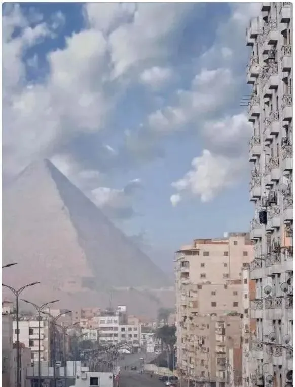 从开罗城区望过去,金字塔就安安静静蹲在楼群背后,浅黄色的塔体被薄雾一裹,街口电线杆和旧空调外机把年代感拉了出来,旅游广告里都是广角大景,这张接地气,像你拎着菜从市场回家,抬头就能看见古代的影子。