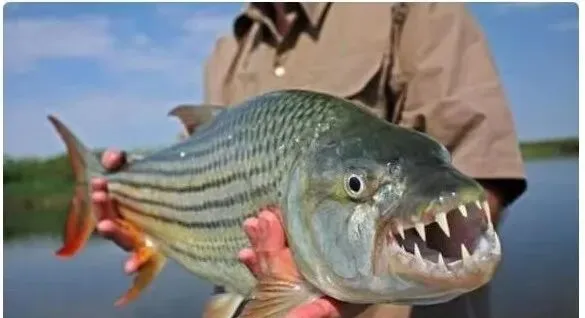 这条横着条纹的猛鱼叫虎鱼,嘴里一排白森森的尖牙,抿一下就露出来,拿在手上得卡住腮帮,不然一挣就扎人,河面风平浪静,它藏在水草影子里,冷不丁窜出一口咬住猎物,渔民的手套都是厚的,有道理。
