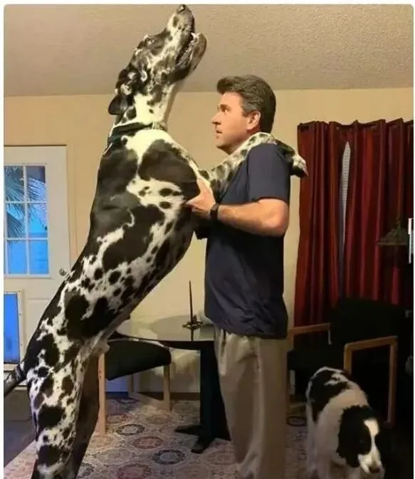 这个长个儿的狗叫大丹犬,黑白花的毛像泼墨,站起来能把主人脖子圈住,屋里一抬头差点顶着天花板,性子却温顺,来客人只会摇尾巴,妈妈第一次看见笑着说这要牵出去溜,怕不是我被它遛。