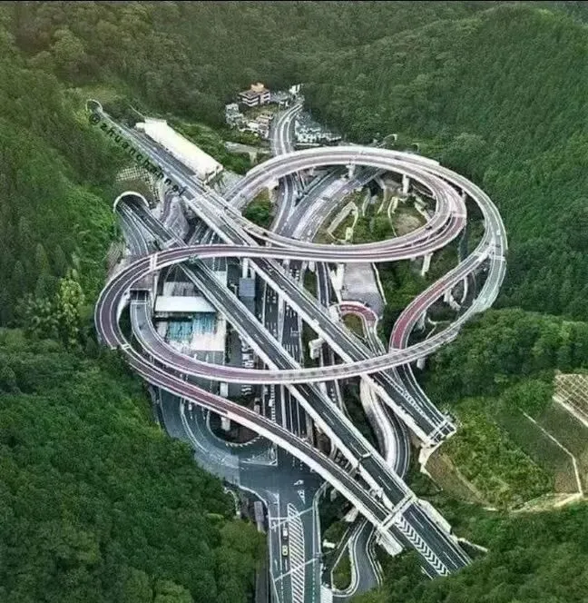 这座盘成“∞”的立交桥在山间绕出好几个圈,车道一层压一层,桥墩落在树海里像棋子排阵,转向匝道弯得优雅,工程师把空间抠到极致,为的是减少占地和噪音,走一遍像坐过山车,从隧道钻出来又压回坡上,司机都忍不住啧啧两声。