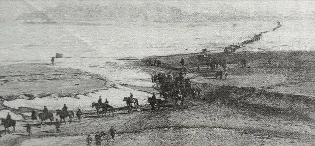 图中这条黑压压的队伍叫登陆行军纵队,冰面和滩涂把路拉得老长,马队在前,人推辎重在后,旗杆在风里抖,脚下坑洼的泥痕像一条被冻住的河,老人说那年腊月里风刮得狠,潮水退了又上,日军就这么踩着山东半岛的冷硬土地一路压过来。