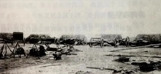 行军时堆在一起,打起来就分不清谁是谁的了,手推车的辐条细长,三脚架上横着测距板,一地都是忙乱收尾的痕迹,看着就知道这仗不是一上午能打完的活。