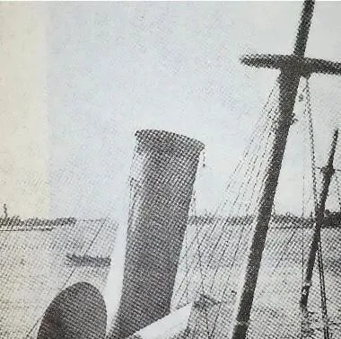 旁边挂着网绳,斜桅探出一点尖,白灰的底片上能看出烟灰蹭过的痕,蒸汽走这里排,黑烟直冲天,小时候翻画报我就喜欢这类特写,什么都不多,只给你一个硬生生的部件,偏偏最能勾出整条船的影子。