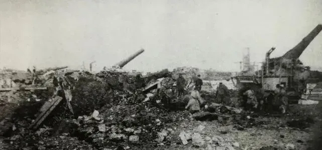 两门大炮躺在瓦砾里,炮座斜着,钢板被扯成片,像被风卷的树皮,照片边角糊了些,可那股子冷硬劲儿一点不糊,真东西就是这样,不多说,却把人心吊在嗓子眼上。