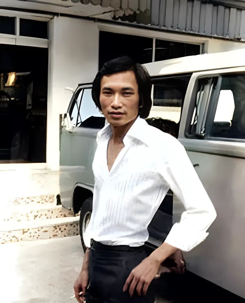 图里这位穿白衬衫的导演就是吴宇森,衣领敞着一指宽,腰间皮带系得利落,身后停着旧款小面包,像极了片场里随时准备拉灯架和轨道的工作车,脸上那股子年轻却不服输的劲儿,一下就把人带回到七十年代的香港片厂。