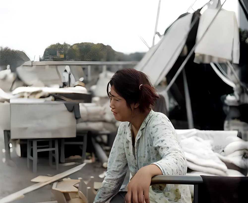 这个孩子坐在临时搭起的床沿上,头发胡乱别着,袖口卷起一道薄灰,背后是塌落的屋檐和拧成一团的椅腿,眼睛没红到发肿,却像把眼泪都咽到喉咙里了,静得让人慌。
