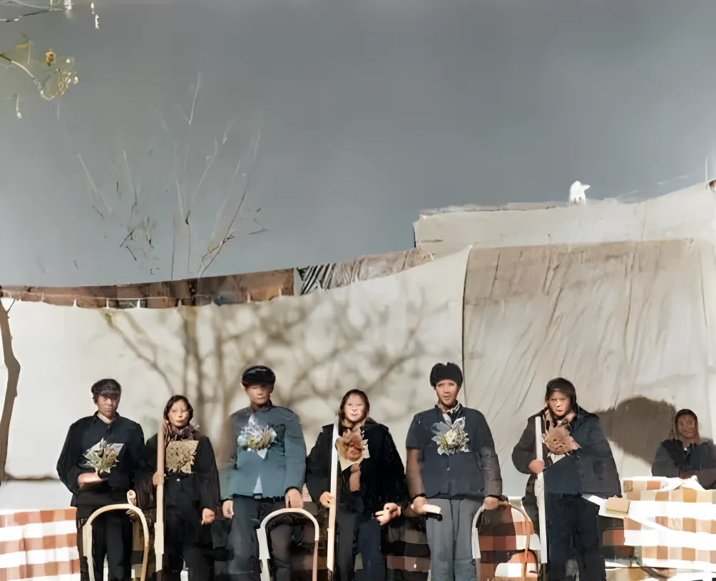 这张里一排年轻人胸前别着纸花,手里拄着铁锹和柳条筐,场地是露天搭的,后面帘布被风鼓起来,影子压在他们脸上,喜气不张扬,却有股硬气。